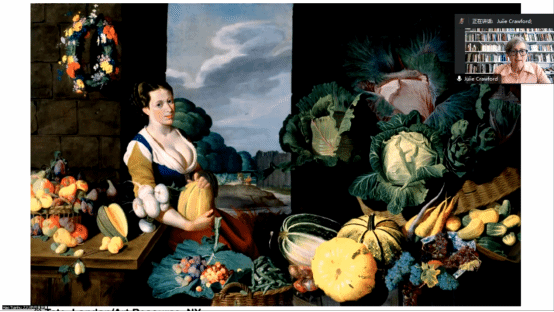 最后,Crawford教授对女诗人与文学传统进行了集中论述。通过分析几位女诗人如Wroth, Pulter, Hutchinson, Cavendish等对于色彩的运用,Crawford教授展示了女诗人对于色彩、情感、理智等诸多主题的独特描绘,同时教授引导听众比较上述诗人作品与Nathaniel Bacon的油画Cookmaid with Still Life of Vegetables and Fruit,来观察女诗人在呈现女性与自然世界的关系时,她们与过往传统的与众不同之处。Crawford教授也对Katherine Philips等女诗人的论文诗进行了一定讨论,从而拓展了听众对于早期现代女性写作的视野。