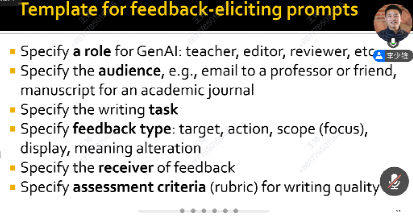 随后,李教授聚焦生成式人工智能背景下的书面纠正性反馈研究与实践,对当前研究范式提出了深刻反思。他指出,AI反馈研究应避免陷入早期计算机辅助语言学习研究中将“工具本身作为独立变量”的误区,而应回归反馈本质,关注其对语言习得过程的影响机制。通过具体案例,李教授深入阐释了提示工程(prompt engineering)在生成准确、一致、有效反馈中的关键作用,提出了包含角色设定、受众分析、任务描述与评价标准在内的AI反馈指令优化框架,为相关教学与研究提供了切实可行的方法指导。