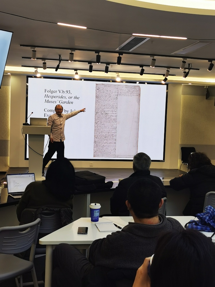 2025年12月24日,浙江大学郝田虎教授受外国语言文学学院邀请作了主题为“外国文学文献学研究”的学术讲座。本次讲座由英文系王爱菊教授主持,文学院张箭飞教授、西班牙语系翁妙玮教授、英文系黄忠副教授、何佳韦副教授出席,英文系部分硕、博士研究生以及来自兄弟学校的教师代表参加了讲座。
