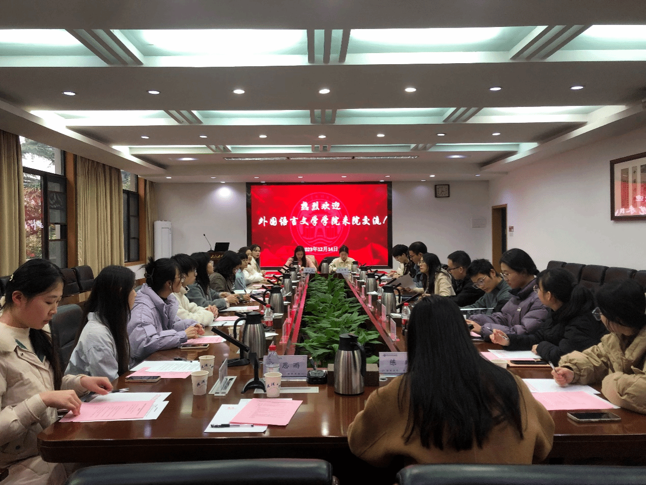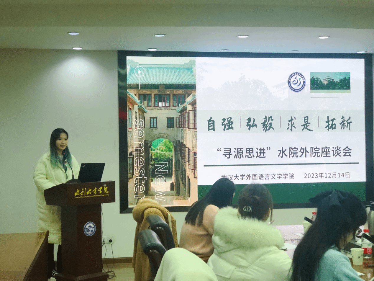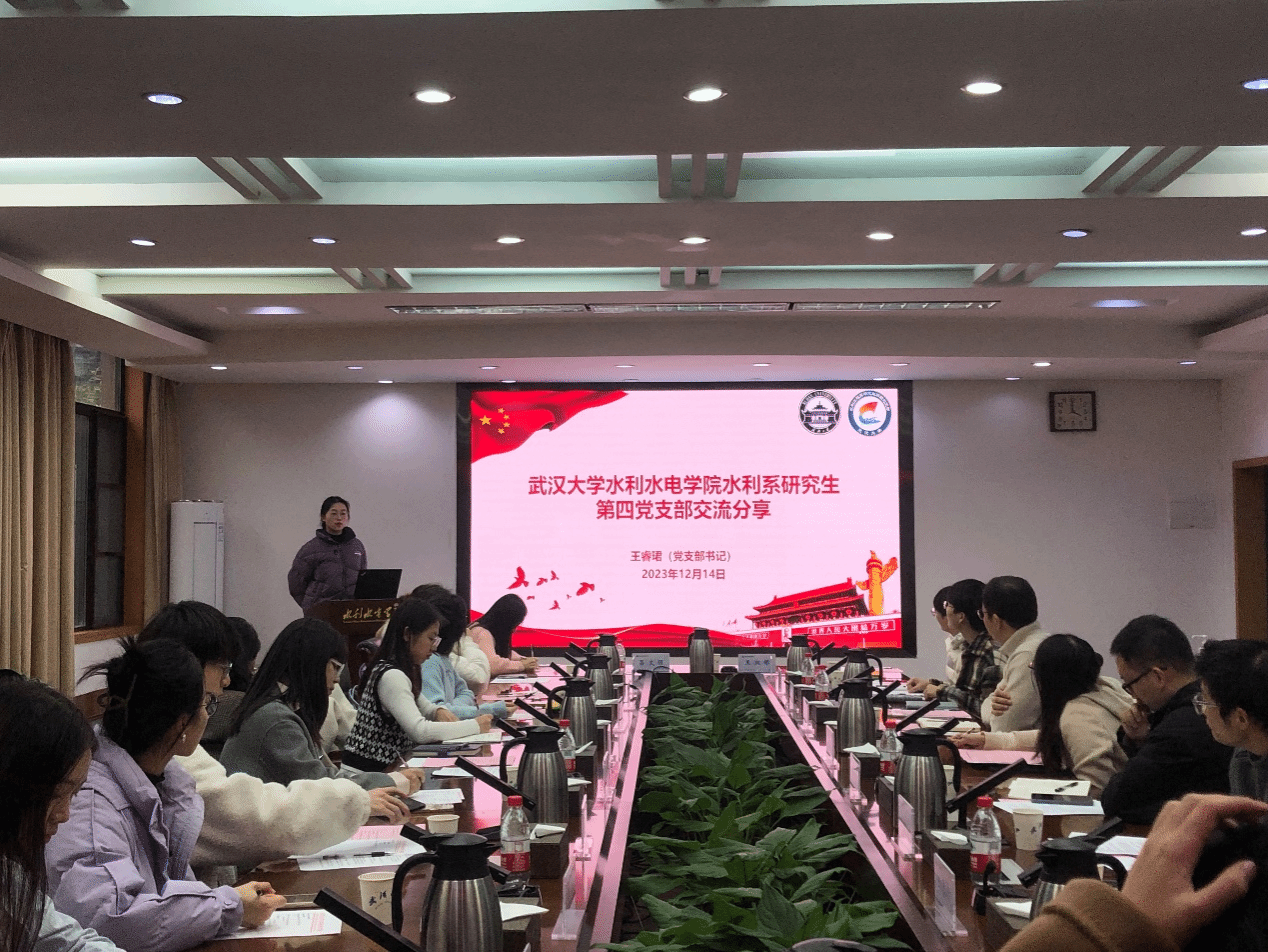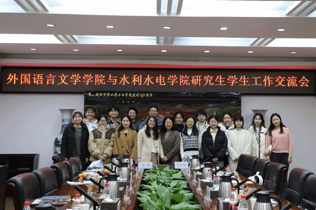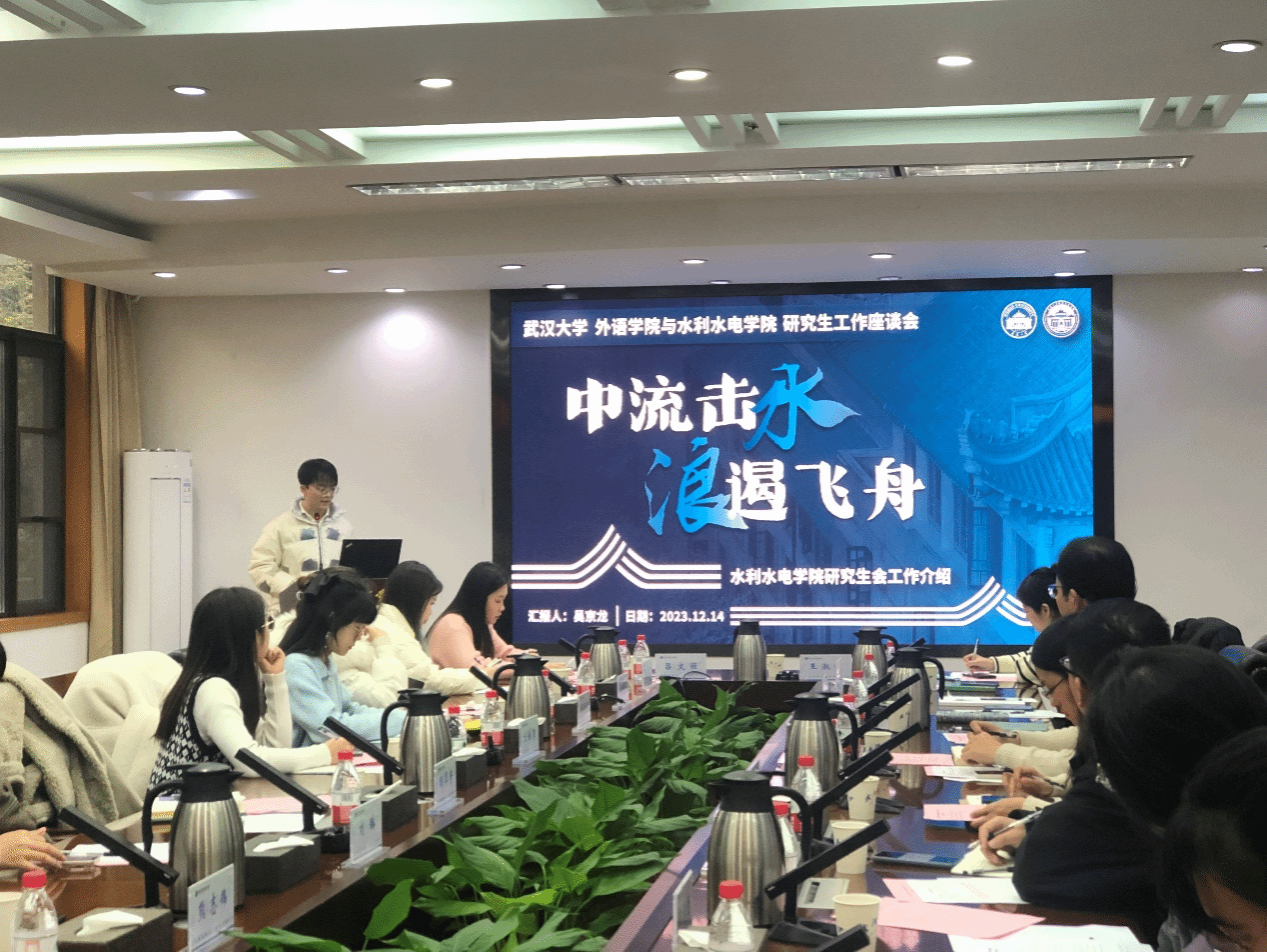 (通讯员:王淑娣 图片:周思雨 包文静)2023年12月14日15:30,武汉大学外国语言文学学院与水利水电学院研究生学生工作交流会在水利水电学院8213会议室顺利召开。武汉大学水利水电学院党委副书记左志香书记、研究生辅导员许笑星老师、研究生兼职辅导员邱钦焱老师、研究生兼职辅导员包文静老师、研究生党总支学生负责人童政、水力发电工程系研究生第七党支部书记陈治光、水利工程系研究生第四党支部书记王睿珺、研究生会执行主席吴京龙、研究生团总支书记余懿凡、研究生会主席贾璐蔓,武汉大学外国语言文学学院党委副书记周翠芳书记、研究生辅导员宋皓瑜老师、研究生兼职辅导员刘璐老师、研究生党总支学生常务副书记林玉红及各委员、研究生会主席杨晨露、研究生会主席周汝琳及各部门负责人参加本次交流会。会议由水利水电学院党委副书记左志香书记主持。