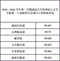 根据《武汉大学外国语言文学学院研究生会骨干考核制度》《武汉大学外国语言文学学院研究生会2023-2024学年第一学期述职方案》关于骨干考核的相关要求,现将主席团成员及部门负责人评议考核结果公示如下: