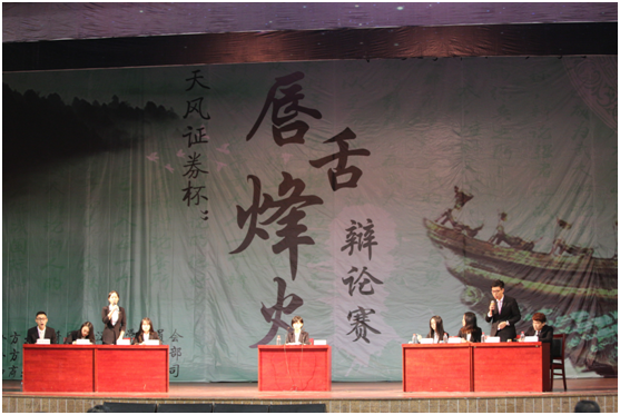 2016年11月20日晚,武汉大学第十三届学术文化节“天风证券杯”唇舌烽火辩论赛决赛于信部大活拉开了帷幕,参赛的队伍分别是历史学院辩论队、文学院辩论队、新闻与传播学院辩论队以及外国语言文学学院辩论队。其中,外国语言文学学院辩论队对阵新闻与传播学院辩论队,就“应不应该支持职业打假人”这一辩题来往交锋,展开了对季军之席的争夺。外院辩论队持反方观点“不应该支持职业打假人”,此次派出一辩叶绍萍、二辩曹芃芑、三辩何虹杜和四辩李赛出战。双方辩手才思敏捷、妙语连珠,为观众提供了一场真正的文化盛宴。最终,外院辩论队虽不敌新传辩论队未能获得季军,但仍以殿军的佳绩为此次金秋之战划下了意义非凡的句点。