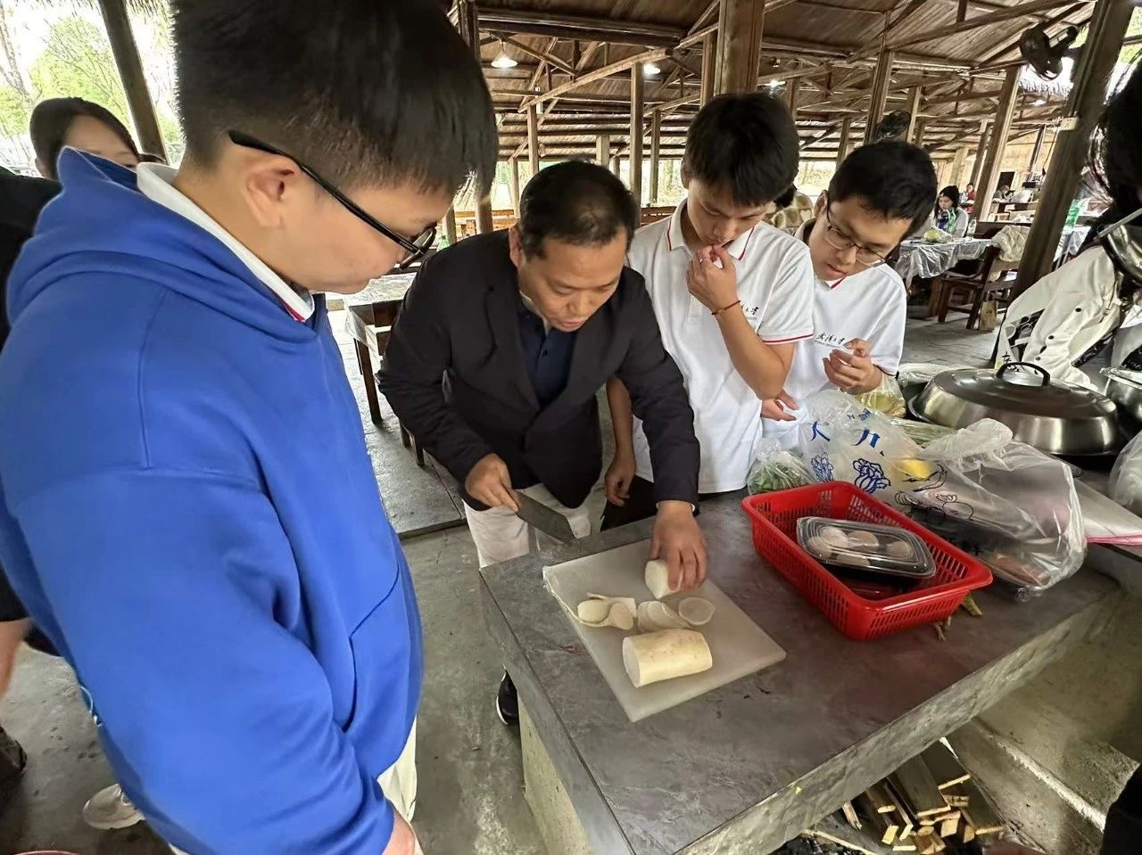 院党委书记黄宏发为劳动导师张建兵颁发聘书,并由劳动导师开展相关知识的讲解,和烹饪技能教学。在讲解中,张建兵老师对中华文明源远流长的饮食文化进行回溯,带领同学们认识到中餐在世界饮食文化中的独特地位与烹饪技法的独特之处,针对地域饮食张老师讲解了湖北菜的特点,并对同学们即将烹饪的菜肴进行了简单讲解和安全提示,与助手陈海洋一起为同学们讲解了如何安全切配蔬菜。