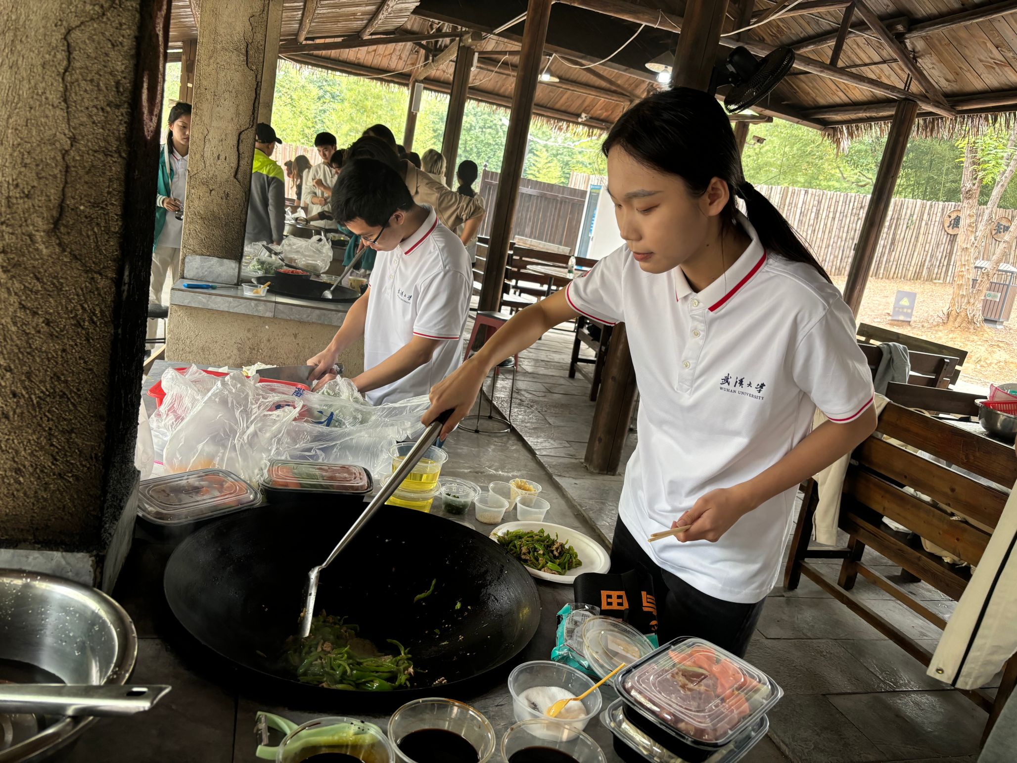 党委书记黄宏发、三位班级导师和团队成员一起,尝试使用老式柴火灶烹饪午餐,在烟熏火燎中,团队成员分工合作,有的负责生火,有的负责洗菜切配,有的则掌勺烹饪。在锅碗瓢盆的碰撞中奏响欢快而忙碌的乐章,在炊烟袅袅中体会到劳动的艰辛与满足在品尝自己亲手制作的美食时,每个人的脸上都洋溢着满足与幸福的笑容。