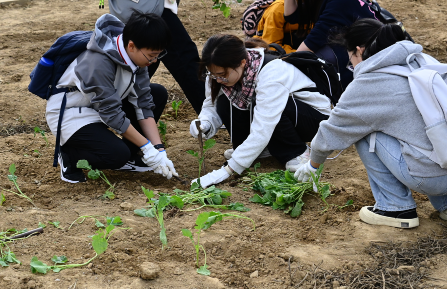 随着工作人员一声令下,7个小组向着任务点进发,师生们要在规定时间之内,在园区内迅速找到对应的打卡位置,并完成菜苗定值、扎染白布、农事星主播三个定点劳动任务。7个小组各自有自己的进度把控,在队长的带领下,有条不紊的染好自己满意的花色,在田野上奔跑,种植好每一颗菜苗,在助农直播环节卖力地描述农作物的优良品质。在任务完成之后,师生们获得了柴火灶所在地的入场券。在挥汗如雨的过程中,大家深刻体会到了劳动的艰辛与不易,也将更加珍惜每一粒粮食与每一份劳动成果。