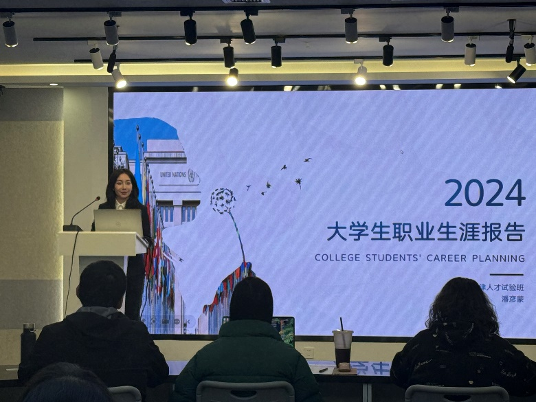 而潘彦蒙同学也在系统地研究国际组织的工作内容、岗位需求和发展路径后,结合自我认知与时代对语言复合型人才的需求,以“英语+国际法”为发展方向,将国际组织工作者作为自己的职业目标,决定通过自身的语言和专业技能参与国际事务,推动实现法的公平正义。在成果展示环节,她回顾自身丰富的志愿经历与国际组织实训经历,展现了实现职业目标的信心与决心。并通过短期与长期规划,对实现职业目标的行动过程进行动态调整评估,她将继续关注国际法发展动向并加强国际法学习,并前往香港攻读法学硕士,进一步提升核心能力。同时,她也分解了自己进入职场后的任务与目标,力求明晰未来具体职业的发展路径。
