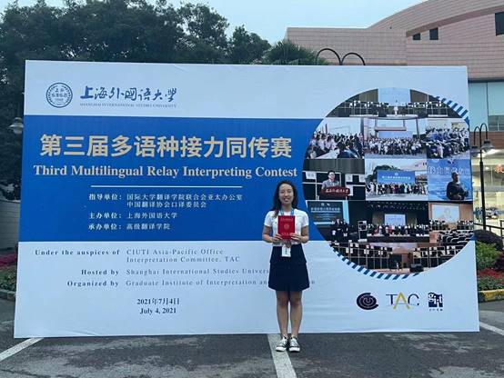 2021年7月4日,上海外国语大学第三届多语种接力同传决赛在上海外国语大学虹口校区逸夫堂举行。法文系本科三年级孙连莹同学代表武汉大学参加比赛,荣获法语组三等奖。苏昉老师作为指导教师并担任大赛评委。