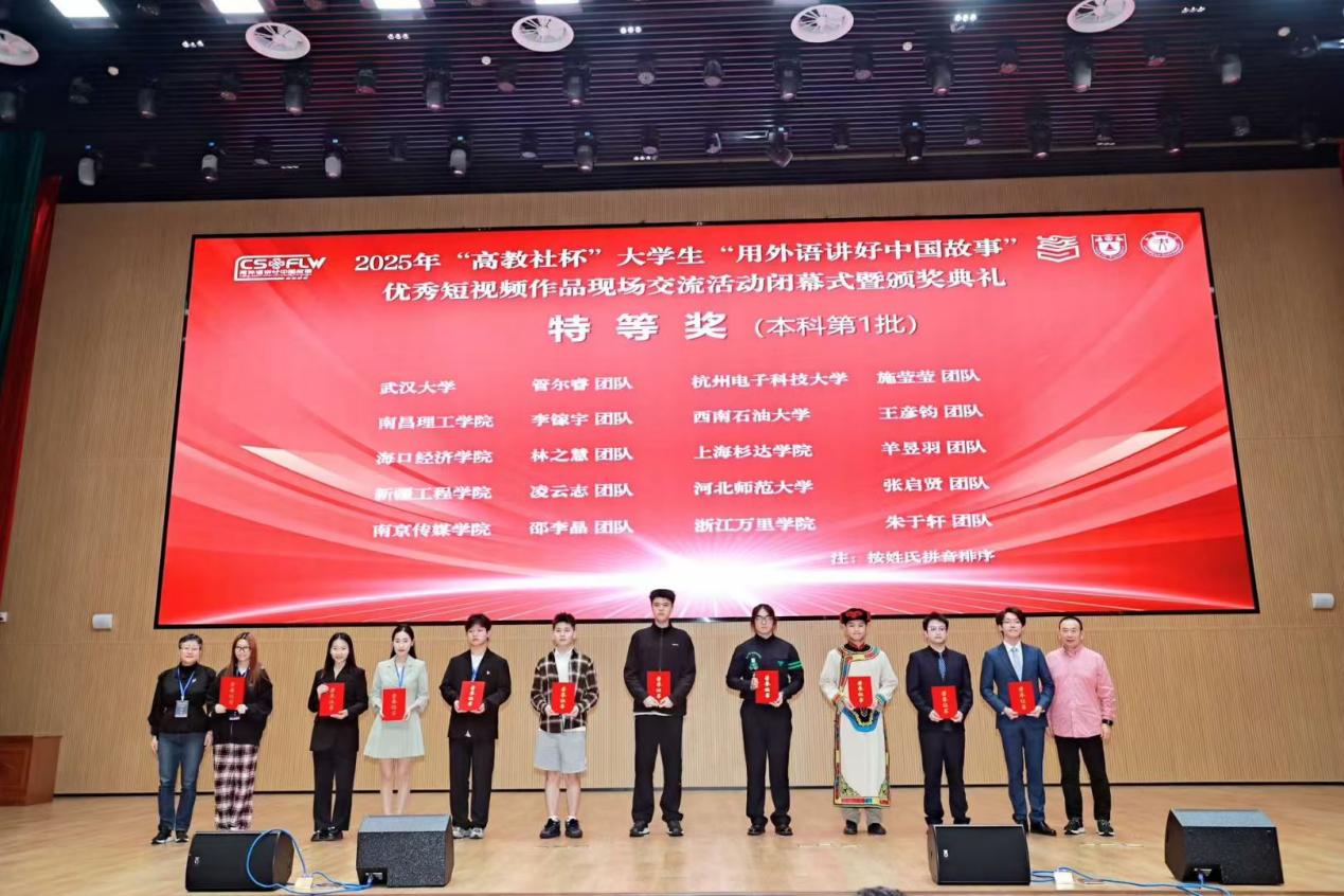 9月19日至21日,2025年“高教社杯”大学生“用外语讲好中国故事”优秀短视频作品征集活动全国总决赛在武汉落下帷幕。由我院翻译系2024级本科生管尔睿带领的团队凭借精雕细琢的短视频作品和出色的演讲阐释,取得了全国特等奖的优异成绩,我院翻译系黄敏老师获得优秀指导教师称号。