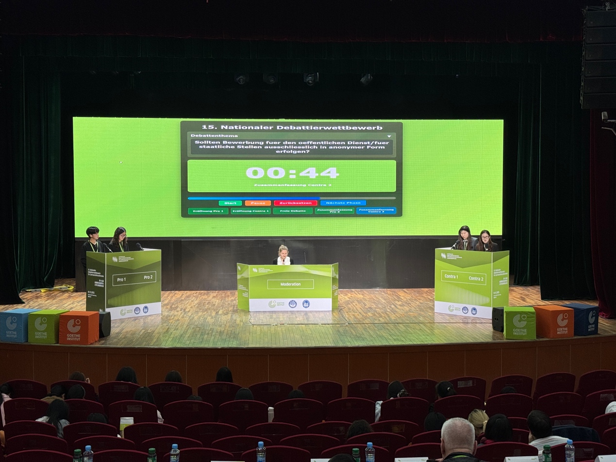 此次德语辩论赛紧扣时代需求,题目聚焦人工智能、数字化、文化、教育等前沿议题,有助于激励学生关注国际动态、拓展知识视野,促进跨学科素养的融合发展。此外,比赛在模拟真实国际对话场景中深化了青年一代对中德社会与文化的理解,为培养具备跨文化沟通能力、全球视野与协作精神的复合型人才奠定了坚实基础。我院两位同学在比赛中呈现出的专业素质和精神风貌,充分彰显了学院推行“外语+”复合型人才培养的成效,也体现了德文系在本科人才培养方面的优秀成果。