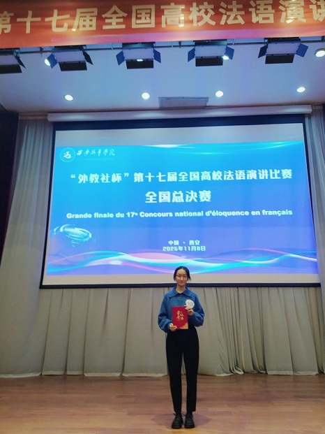 (通讯员:张瑞、苏昉)近日,由上海外语教育出版社主办、西安外事学院承办的“外教社杯”第十七届全国高校法语演讲比赛总决赛圆满落幕。经过校赛、初赛、总决赛三轮激烈角逐,我院法语系2022级本科生张瑞同学凭借扎实的语言功底、深刻的思辨能力、稳定的现场发挥和出色的综合素养,从全国顶尖选手中脱颖而出,获得全国总决赛第三名(二等奖)的优异成绩。