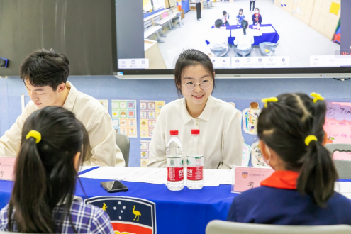 如何把握时间,在有限的时间内通过专业提问引导孩子们尽可能展示自己的英语水平?如何多方面考察孩子综合素养并通过科学细致的评分准则对每位候选队员的能力进行评估和记录?这些都难不倒口译队的队员们。队员们用自信流畅的表达、优美标准的口音、亲和不失稳重的气质,充分向澳洲国际学校全体师生展示了武大外院口译队员的专业风范。